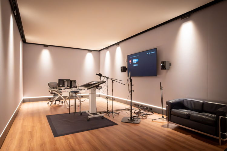 The technical design incorporates advanced acoustic analysis, customised surface treatments optimised for voice recording, and a symmetrical geometry in the control rooms, which required relocating studio windows. While identical in size at approximately 40 square metres for recording rooms and 15 square metres for control rooms, each studio features distinctive colour schemes to create unique environments.